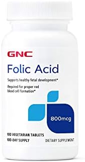 GNC Folic Acid – 800 mcg Supports healthy fetal development.* Required for proper red blood cell formation.* Adequate folate in a healthy diet may reduce a woman’s risk of having a child with a brain or spinal cord defect. 100 vegetarian tablets 100-day supply Gluten free Kosher These statements have not been evaluated by the Food & Drug Administration. This product is not intended to diagnose, treat, cure, or prevent any disease.