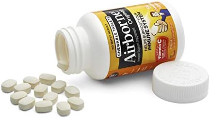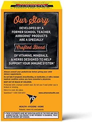 Airborne Chewable Tablets provide immune support* in great-tasting flavors and an easy-to-take form; no water needed. Each serving of (4) tablets delivers a blast of 1000 mg of Vitamin C and 13 vitamins, minerals, & herbs (including Vitamins A & E, Zinc, Selenium, Manganese & Magnesium. Also contains a proprietary herbal blend with Echinacea & Ginger). Developed by a former school teacher, Airborne products are a specially crafted blend of vitamins, minerals & herbs designed to help support your immune system.* Airborne is the #1 Immune Support Gummy, Effervescent and Chewable Brand‡ *These statements have not been evaluated by the Food and Drug Administration. This product is not intended to diagnose, treat, cure or prevent any disease. ‡Based on unit sales L52W ending 4/3/2021.