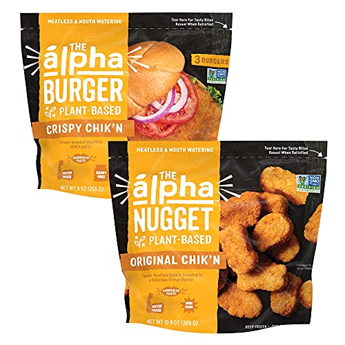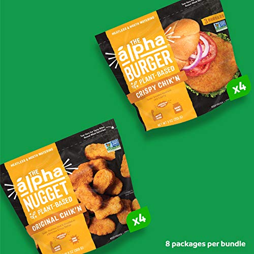 Alpha Foods Chik’n Nugget + Burger Variety Pack | (Pack of 8) | 100% Vegan, Plant-Based Protein | Breaded Chicken Nuggets | Breaded Chicken Patty | Frozen Meat Substitute