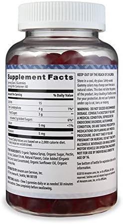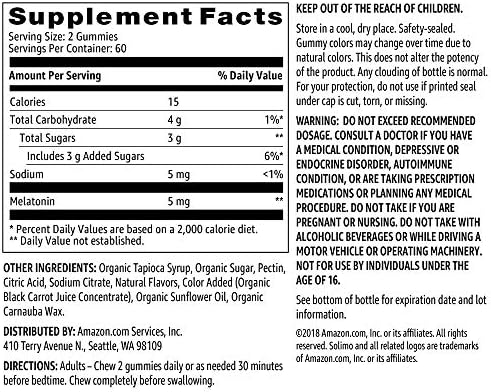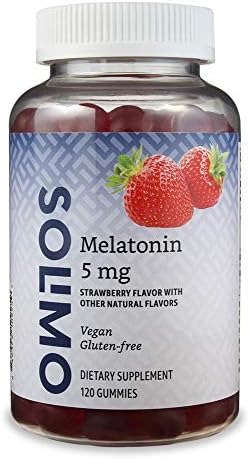 Solimo Melatonin gummies feature strawberry flavor with other natural flavors. They’re vegan and gluten-free. Adults – chew two daily or as needed 30 minutes before bedtime.