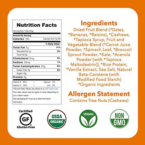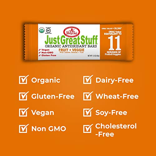 CERTIFIED ORGANIC, ALL-NATURAL & NON-GMO: Goodness, pure & simple. These vegan protein bars contain Just Great Stuff – dates, bananas, carrots, spinnach, cashews & more – all organically grown.