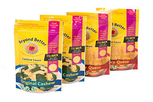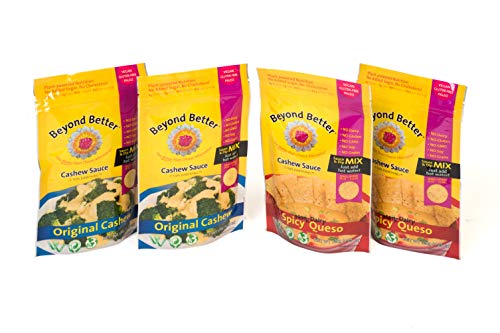 Based on the popularity of this combo, we created a 4 pack with 2 packages of our Original Cashew and 2 packages of our Spicy Queso Sauce mixes. The Better Than Cheese Alternative, It Tops Everything! Just add boiling water for instant flavor and nutrition! Loaded with B12, protein, fiber, and lots of vitamins and minerals. Organic ingredients, non-GMO, Gluten-free, Dairy free Soy-free, Grain-free, Vegan and Paleo. All our sauces are great for nachos, tacos, mac’n’cheese, potatoes, sweet potatoes, french fries, steamed or roasted vegetables, pasta, add creaminess and delicious flavor to soups. Recipes at beyond-better dot com.