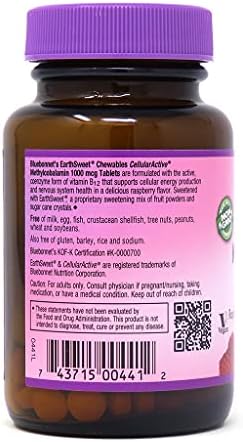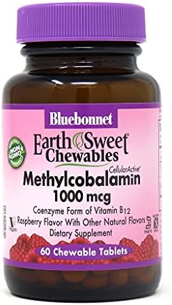 Bluebonnet’s Earth Sweet Chewable Methyl cobalamin Vitamin B 12 5000 mcg Tablets contain pure, high potency crystalline vitamin B12 (methyl cobalamin) in a delicious natural raspberry flavor. Sweetened with Earth Sweet, the industry’s first all natural sweetening mix of juice concentrates (wild blueberry, cranberry, strawberry, grape, raspberry, and bilberry fruits, grape seed and raspberry seed extracts) and cane crystals. Available in chewable tablets for maximum assimilation and absorption. Vitamin B12 is used for treating and preventing vitamin B12 deficiencies. It can also be used for memory loss, Alzheimer’s disease, boosting mood, energy, concentration, and the immune system, and also for slowing aging. Vitamin B12 is required for the proper function and development of the brain, nerves, blood cells, and many other parts of the body.