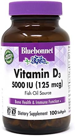 Bluebonnet’s Vitamin D3 5000 IU Softgels contain vitamin D3 (cholecalciferol) that supports strong healthy bones and immune function from molecularly distilled, deep sea, cold water, fish liver oil in a base of non-GMO safflower oil. Available in easy-to-swallow softgels for maximum assimilation and absorption. ♦