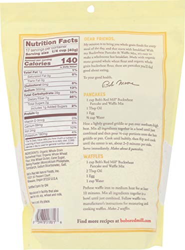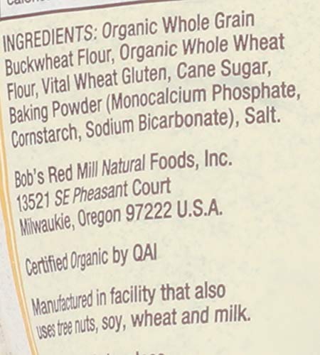 Bob’s Red Mill buckwheat pancake mix is made with organic buckwheat and whole wheat flours, non-aluminum leavening, and raw cane sugar. We hear this mix brings nostalgic memories of buckwheat pancakes from our customers’ Childhoods. From your pantry, you’ll just need to add 1 egg (or 2 for waffles,) 1 Tbsp oil (or 2 for waffles,) and 3/4 cup cold milk. One package makes about 57 four-inch pancakes.