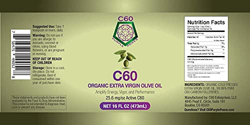 HIGHEST QUALITY & PURITY: C60 Purple Power Organic Extra Virgin Olive Oil is made with 100% certified organic oils and the highest purity (99.99%) C60 with maximum concentration. C60 Purple Power is professionally formulated and tested for purity, quality, concentration, and maximum bioavailability and made in the USA.