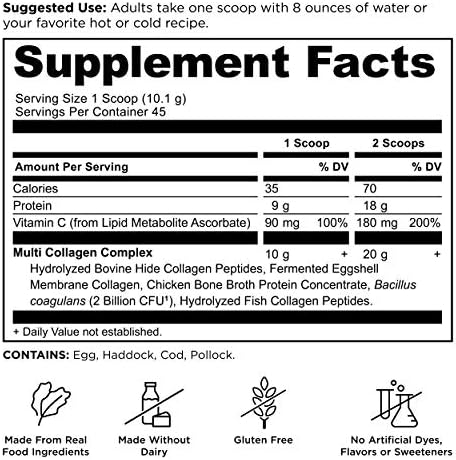 BURSTING WITH BENEFITS – Every scoop features hydrolyzed collagen types I, II, III, V, and X from 4 food sources (Beef, Chicken, Fish and Eggshell Membrane). Our collagen powder is Non-GMO, grass fed and pasture-raised, made without hormones, cage free an