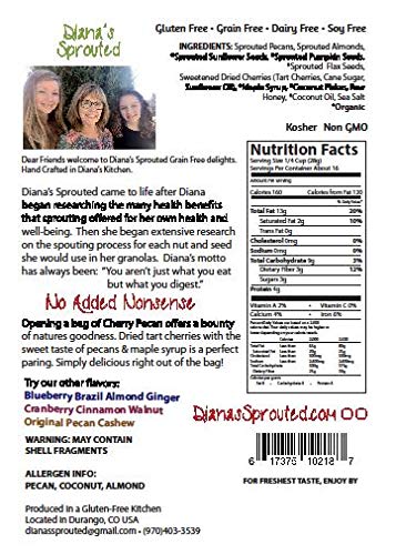 Opening a bag of our Cherry Pecan granola offers a bounty of nature’s goodness. Dried tart cherries contrast perfectly with the sweet taste of toasted pecans & maple syrup – the perfect pairing! Enjoy this healthy granola with milk, yogurt, on salads, or right out of the bag! This delicious granola contains no gluten, wheat, grains, soy, peanuts, or dairy, making it suitable for most dietary restrictions and preferences. Our granola is lightly sweetened with organic syrup, and gently toasted to bring out all the best flavors of our natural ingredients. Try it today to see why Diana’s Sprouted is Granola, Redefined! Ingredients: Sprouted Pecans, Sprouted Almonds, *Sprouted Sunflower Seeds, *Sprouted Pumpkin Seeds, *Sprouted Flax seeds, Sweetened Dried Cherries (Tart Cherries, Cane Sugar, Sunflower Oil), *Maple Syrup, *Coconut Flakes, Raw Honey, *Coconut Oil, Sea Salt. * indicates organic ingredient Diana’s Sprouted Grain Free Granola is a delectable blend of nuts and seeds that are sprouted to make them easier to digest. The sprouting process removes phytic acids, neutralizes lectins and enzyme inhibitors! The result? All the nutrients in these super-foods is truly available to your body.