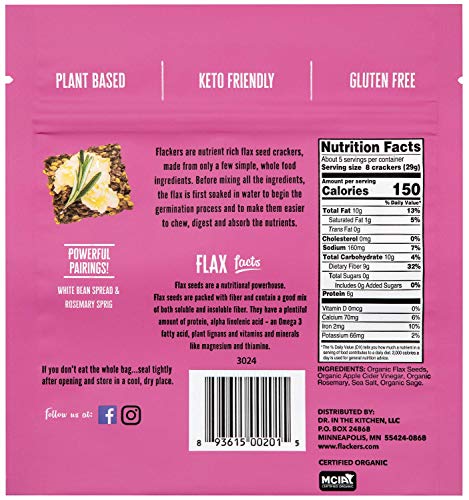 [ad_1] Flackers Flax Seed Crackers, Rosemary, 5-Ounce. Made with organic flax seeds and organic herbs and spices. High in omega 3’s. 6g protein, 9g fiber. Values are per serving. Low carb. Rosemary Flax Seed Crackers are made from Organic Flaxseeds, Organic Apple Cider Vinegar, Organic Rosemary, Sea Salt, Organic Sage. Gluten Free. Vegan. Kosher. Low Carb. Keto. Plant Based.