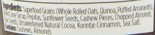 MAYAN BLEND: Superfood Grains (Whole Rolled Oats, Quinoa, Puffed Amaranth), Dried Cane Syrup, Pepitas, Sunflower Seeds, Cashew Pieces, Chopped Almonds, Flax Seeds, Unsweetened Natural Cocoa, Korintje Cinnamon, Sea Salt. Contains: Cashews, Almonds