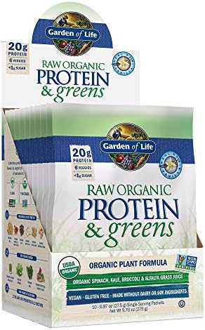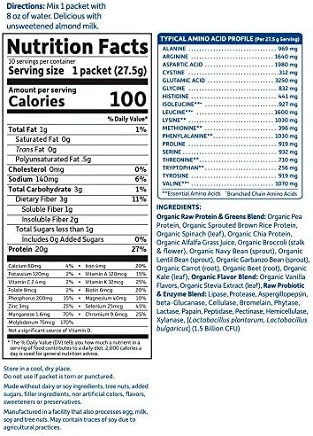 RAW Protein & greens Vanilla is a Certified USDA Organic and Non-GMO Project Verified blend of clean, organic plant protein providing 20 grams of delicious, smooth protein derived from organic pea, organic sprouted brown rice, organic chia, organic navy bean, organic lentil bean and organic garbanzo bean. It’s uniquely blended with six nutrient-rich, energizing, organic greens including organic alfalfa grass juice, organic spinach, organic kale, organic broccoli, organic carrot and organic beets. Flavored with delicious organic vanilla flavors, it is sweetened with organic stevia extract (leaf) to deliver less than 1 gram of sugar.