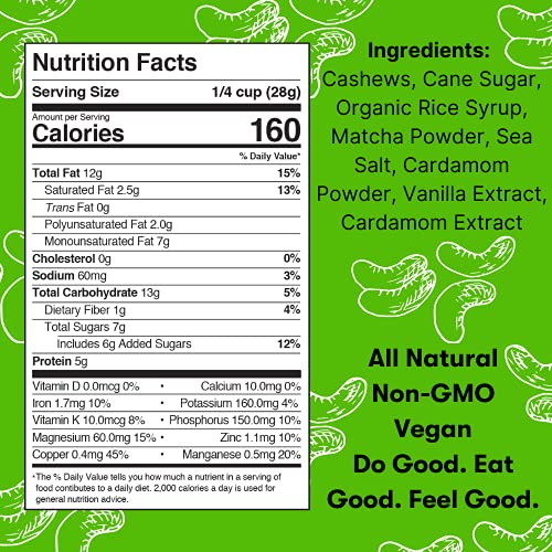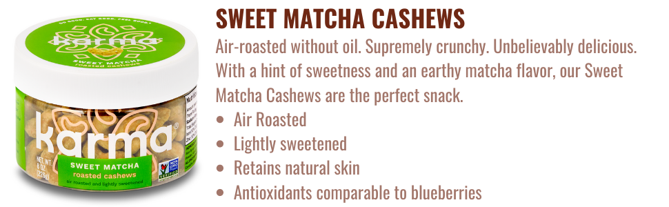 SWEET, SWEET MATCHA: Our Sweet Matcha Cashews are coated with a delicious combination of Matcha Powder, Sea Salt, Cardamom and Vanilla. Perfect for an evening delight, a mid-hike snack, an afternoon treat or an at work pick-me-up. Our Sweet Matcha Cashews will have you feeling like you’re halfway through your favorite Sweet Matcha Latte.