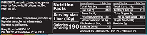 KIND Almond & Coconut bars are satisfying gluten free bars packed with nuts and coconut that you can take anywhere. These KIND nut bars lead with almonds as the #1 ingredient. This snack bar combines quality ingredients like almonds, coconut and honey to deliver a delicious taste with a little crunch. These snack bars come packed as individually wrapped snacks for a convenient option that makes eating on-the-go easier. These dairy-free KIND bars Almond & Coconut have a low glycemic index and are a good source of fiber.* This KIND nut bar is also gluten free and is made without genetically engineered ingredients. *Contains 12g of fat per bar