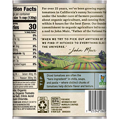 Juicy tomatoes are harvested at peak flavor, peeled, diced and seasoned lightly with a dash of sea salt. Cans made with Non-BPA Lining. Tomatoes are Gluten Free, USDA Certified Organic and Non-GMO Project Verified.