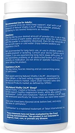 [ad_1] Natural Vitality Calm Specifics, Calmful Sleep, Dietary Supplement Powder promotes a calmful sleep for those times when you need a little extra sleep support. Along with Natural Vitality Calm Specifics, Calmful Sleep features rest-promoting magnesium sourced from the Pacific Ocean, Suntheanine, calm-enhancing GABA and melatonin to help the body ease into restful sleep. Natural Vitality Calm can help quiet a racing mind making it easier to get a good nights sleep. The vegan and gluten free stress relief supplement powder is NON-GMO Project Verified, so you can feel good about what you put in your body. This nutrient-rich drink mix in a Mixed Berry flavor, is easy to prepare. Just add water, let it fizz, then drink when you have occasional sleeplessness. This calming supplement is winner of the 2017 BN Best of Supplements Award and 2017 Amazing Wellness Best New Products. Get the sleep you need to boost your natural vitality with Natural Vitality Calm Specifics, Calmful Sleep, Dietary Supplement Powder.