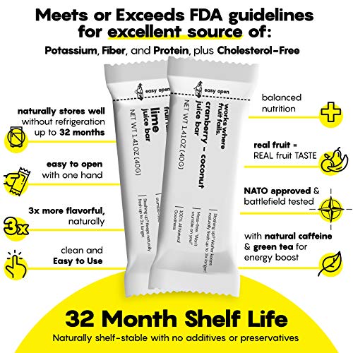 EASILY REFUEL ON THE GO: Whether you need to refuel on a mountain backpacking trip or simply need an on the go option, Nature’s Juice Bar emergency food bars provide a flavorful boost of energy with life-sustaining nutrients such as protein, potassium and fiber wrapped in a non sticky, mess-free wafer.