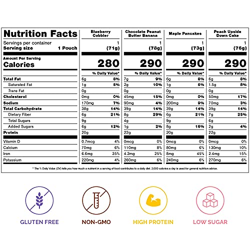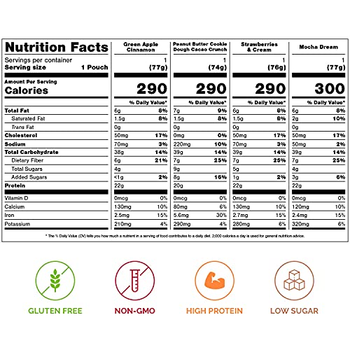 8 DELICIOUS FLAVORS – Chocolate Peanut Butter Banana, Strawberries & Cream, Green Apple Cinnamon, Mocha Dream (which contains coffee!), Peach Upside Down Cake, Blueberry Cobbler, Maple Pancakes, and Peanut Butter Cookie Dough Cacao Crunch