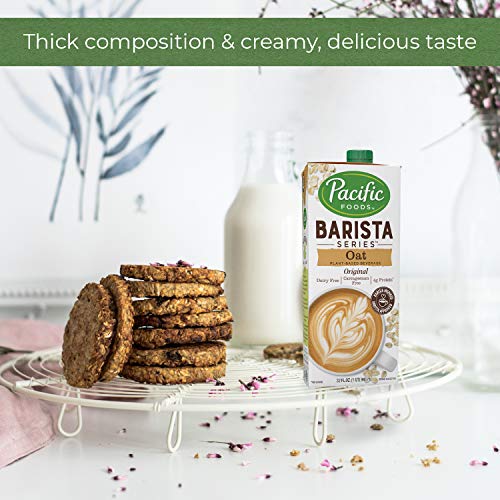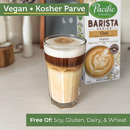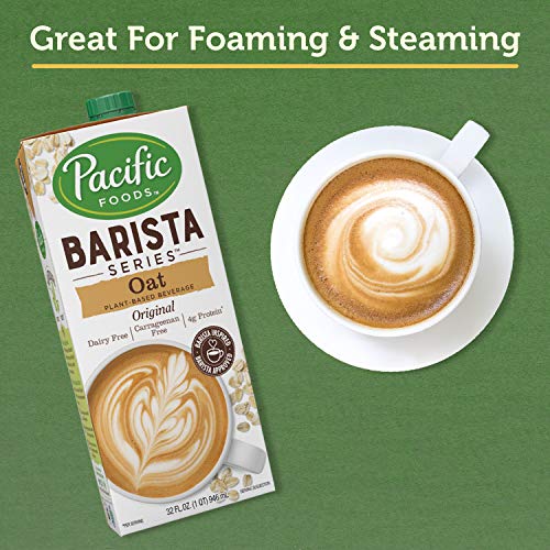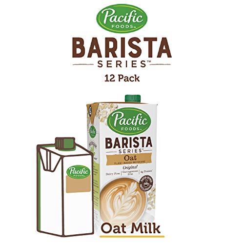 Vegan, Kosher (Parve), and free of soy, dairy, and carrageenans; each order includes 12 32-oz cartons of Pacific Foods Oat Milk Barista Series