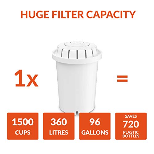 HUGE FILTER CAPACITY – MUCH LONGER THAN OUR COMPETITION = 1500 cups/360 litres/96 gallons per PH001 filter. Saving 720 bottles of filtered water, and $1080, at an average cost of $1.50 per bottle. (search B07Q2CG1Z4)