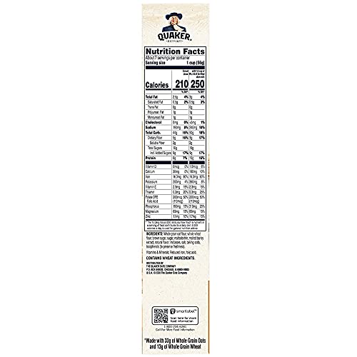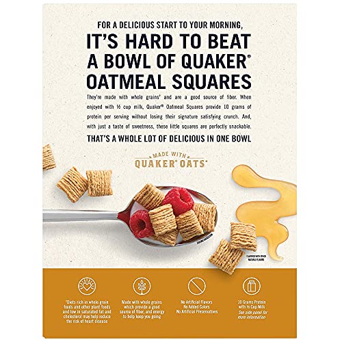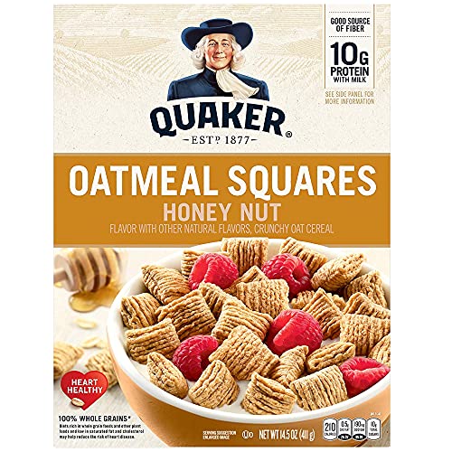Quaker Honey Nut Oatmeal Squares deliver 46g of whole grains in a crunchy cereal with a tasty touch of brown sugar sweetness. Experts recommend eating at least three one-ounce equivalents of whole grains, or 48 grams daily, based on a 2,000 calorie diet. Quaker Oatmeal Squares has 46 grams per serving. Also, this Quaker cereal is a good source of calcium and helps promote heart health (Diets rich in whole grain foods and other plant foods and low in total fat, saturated fat, and cholesterol). Quaker Oatmeal Squares continue the Quaker tradition of bringing hearty, wholesome products to families for over 130 years.