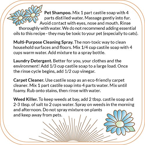 SO MANY USES. One soap, a variety of purposes – from head-to-toe body care, household cleaning, laundry and even pet care. Use it as a body wash, hand soaps, shampoo, face wash, facial cleanser, shaving cream, baby wash, pet shampoo, dish soap, laundry detergent, kitchen and bathroom surface cleaner, bathtub and tile scrub, window cleaner, degreaser, insecticide, antifungal plant spray, and more. You’ll find all our favorite recipes on the bottle.