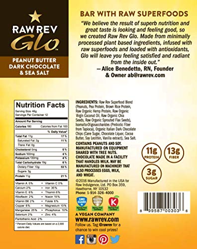 [ad_1] Chocolate and peanut butter pair so well, you’ll only feel good, not guilt! Each Raw Rev Glo Peanut Butter Dark Chocolate & Sea Salt bar is packed with high quality plant-based protein and nutrient-dense whole foods. With 11 grams of vegan protein, no trans-fats and no hydrogenated oils, Raw Rev has raised the bar on nutrition and taste. Raw Rev proudly strives to offer the world’s most nutrient dense products which are affordable, minimally processed, sustainable, and bursting with flavor. Raw Rev Glo bars are always: gluten free, vegan, kosher, non-GMO, free from soy-isolates, corn free, and no artificial ingredients. Let your star Glo!