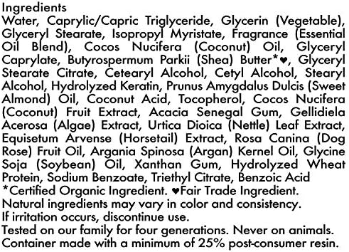 Water, Glyceryl Stearate, Glycerin (Vegetable), Caprylic/Capric Triglyceride, Cocos Nucifera (Coconut) Oil, Glyceryl Caprylate, Cetrimonium Chloride, Butyrospermum Parkii (Shea) Butter*â , Prunus Amygdalus Dulcis (Sweet Almond) Oil, Coconut Acid, Glyceryl Stearate Citrate, Cetearyl Alcohol, Cocos Nucifera (Coconut) Fruit Extract, Algae Extract, Equisetum Arvense (Horsetail) Extract, Argania Spinosa Kernel (Argan) Oil, Rosa Canina Fruit (Rosehip) Oil, Tocopherol, Urtica Dioica (Nettle) Leaf Extract, Acacia Senegal Gum Extract, Hydrolyzed Keratin, Hydrolyzed Vegetable Protein PG-Propyl Silanetriol, Glyceryl Undecylenate, Fragrance (Essential Oil Blend) *Certified Organic Ingredient. â Fair Trade Ingredient Natural ingredients may vary in color and consistency