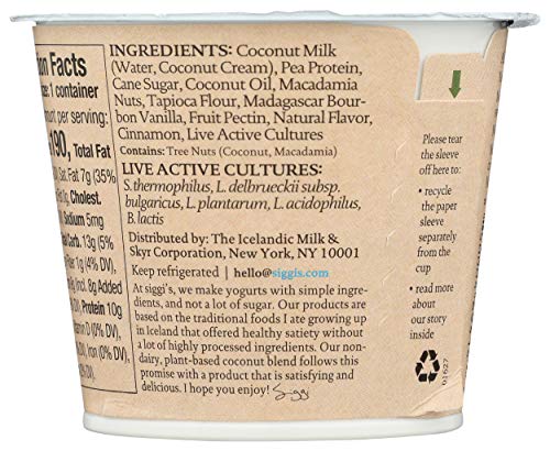 siggi’s Vanilla Cinnamon Plant-Based Coconut Blend is an ode to deeply rooted Scandinavian dairy tradition that has been a part of Icelandic culture for centuries. siggi’s founder wasn’t thrilled with the overly sweet and artificial taste of other US yogurt brands, inspiring him to create thoughtfully simple yogurt sourced from family farms. Our plant-based blend has 3x more protein & 40% less sugar than leading yogurt alternatives, made with a not-too-sweet coconut concoction. On average, siggi’s plant-based flavored products have 1.6g sugar per oz., 1.9g protein per oz., compared to the leading flavored yogurt alternative’s average of 2.9g sugar per oz., and 0.6g protein per oz. Our plant-based blend contains simple ingredients without all those dreadful artificial sweeteners.
