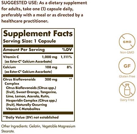 Non-GMO & Gluten Free; Solgar Ester-C Plus with 1000 mg of Vitamin C is free of: gluten, wheat, dairy, soy, yeast, sugar, sodium, artificial flavor, sweetener and color