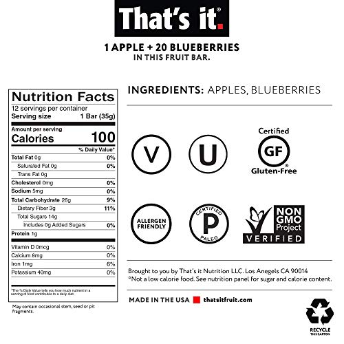 100% NATURAL: Ingredient lists have never been this simple and clean. Made in an allergen-free facility, That’s It. Fruit Bars are nut free, fat-free, non-GMO soy free, pesticide free, diabetic friendly including Vegan, Paleo & Kosher.