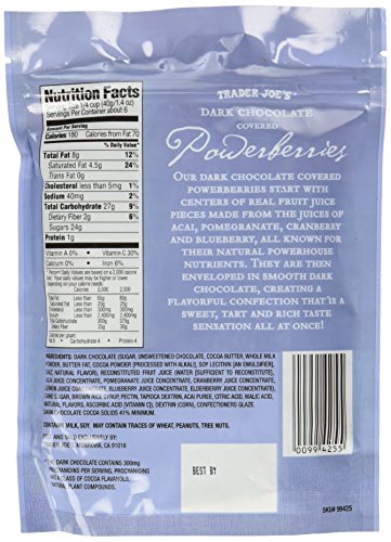Trader Joe’s powerberries are real fruit juice pieces made with acai, pomegranate, cranberry and blueberry juices and dipped in smooth dark chocolate.