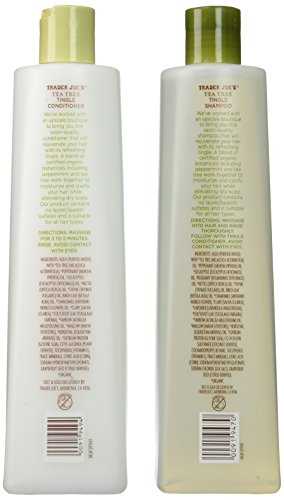 Product Features Trader Joe’s Tea Tree Tingle Shampoo and Conditioner Pack Enriched with Organic Botanicals Balanced Shampoo That Will Clean and Protect Adds Moisture and Manageability Cruelty Free (Never Tested on Animals) – No Animal Products in Ingredients Product Description Pack of 1 Trader Joe’s Tea Tree Tingle Shamppo and 1 Trader Joe’s Tea Tree Tingle Conditioner. When your hair is dry, it needs to be nourished. This balanced shampoo will clean and protect. While adding moisture and manageability, it infuses shine everyday, all day. Enhanced with organic botanicals, it does not contain laurel/laureth sulfates.