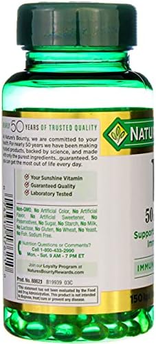 Size: 150 count. A daily dose of Vitamin D3 by Nature’s Bounty is a simple and effective way to show your immune system some love.* That’s because Nature’s Bounty Vitamin D is an essential nutrient for immune support.* By assisting with calcium absorption, Nature’s Bounty Vitamin D3 also helps maintain healthy bones in adults and it provides the benefits of the natural sunshine that living and working indoors can deprive us* Vitamin D softgels from the vitamin experts at Nature’s Bounty combine science, nature and 50 years of expertise and innovation to provide the easiest way to increase your daily intake of this important nutrient. When wellness is everything, the vitamin experts at Nature’s Bounty have everything you need to get there. Our rapid release Vitamin D3 Softgels are non-GMO, gluten- and sugar-free, and contain no artificial colors, or sweeteners.