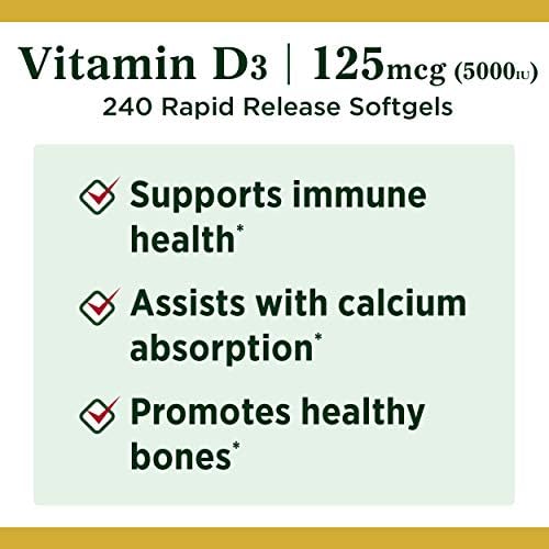 Size: 240 count. A daily dose of Vitamin D3 by Nature’s Bounty is a simple and effective way to show your immune system some love. That’s because Nature’s Bounty Vitamin D is an essential nutrient for immune support. By assisting with calcium absorption, Nature’s Bounty Vitamin D3 also helps maintain healthy bones in adults and it provides the benefits of the natural sunshine that living and working indoors can deprive us. Vitamin D Softgels from the vitamin experts at Nature’s Bounty combine science, nature and 50 years of expertise and innovation to provide the easiest way to increase your daily intake of this important nutrient. When wellness is everything, the vitamin experts at Nature’s Bounty have everything you need to get there. Nature’s Bounty is committed to safety and purity in all our supplements. Our rapid release Vitamin D3 Softgels are non-GMO, gluten- and sugar-free, and contain no artificial colors, or sweeteners.