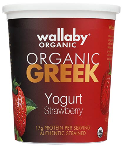 Wallaby strawberry whole milk greek yogurt is grade-a, organic strained yogurt with probiotics. This gluten-free yogurt is 260 calories per serving and provides 17 gram of protein. This yogurt has a thick texture and is made in small batches with whole milk. The 32 ounce container holds 4 servings of strawberry-flavored greek yogurt.