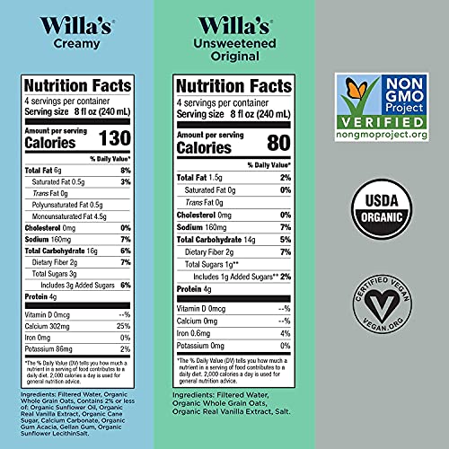 Dairy Free, Organic, Plant Based & Vegan. Willa’s uses only the highest quality, USDA organic, Non-GMO and certified vegan ingredients. Our oat milk is naturally nut free, allergen-free, and soy free. It’s an excellent choice for coffee, cereals, and smoothies, or as a plant based alternative in any of your favorite dairy free recipes!