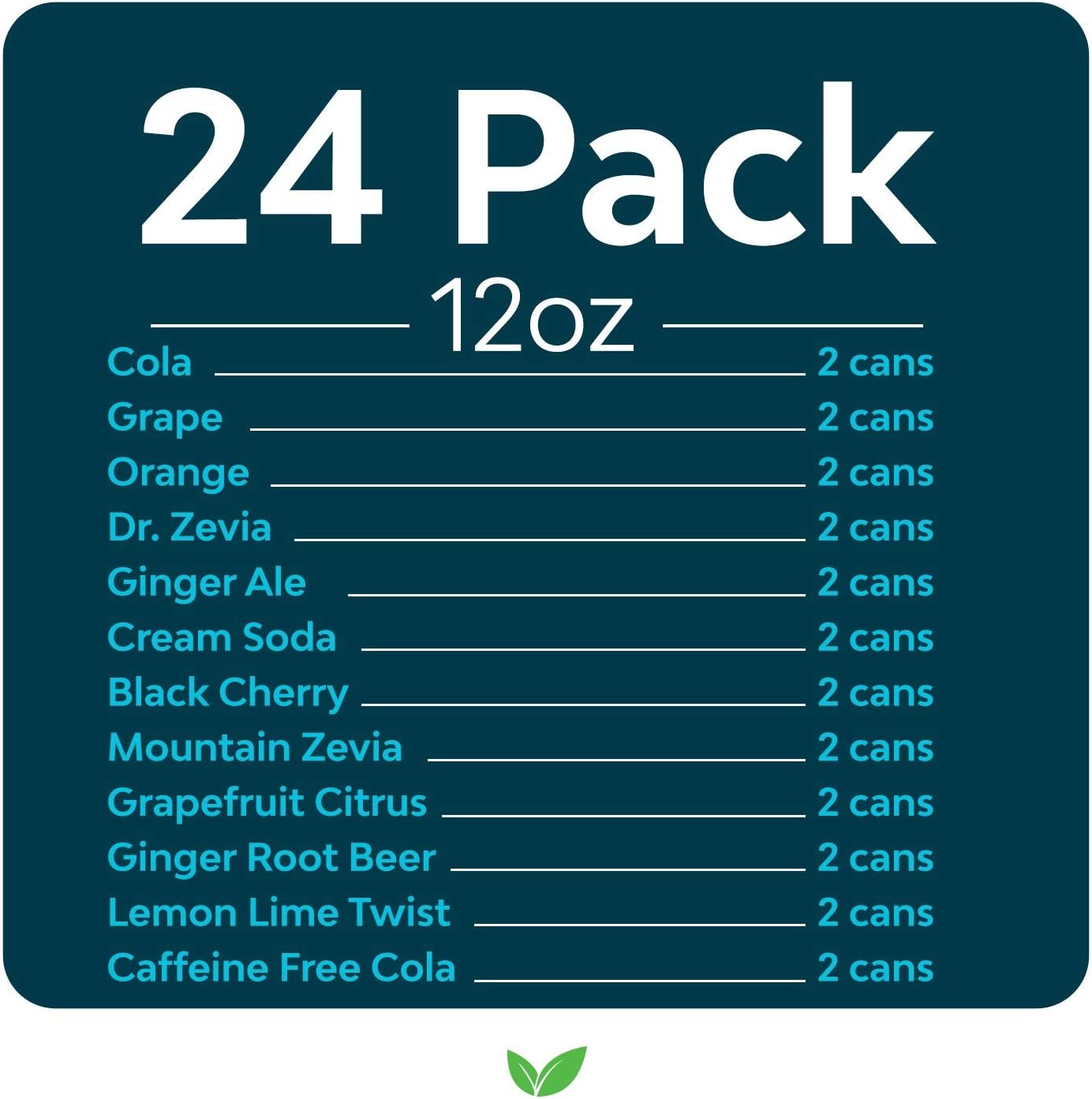 A Rainbow Pack Of Awesome: Each Zevia Rainbow Variety Pack contains two cans of each flavor: Cola, Ginger Root Beer, Ginger Ale, Cream Soda, Grape, Black Cherry, Lemon Lime Twist, Orange, Mountain Zevia, Dr. Zevia, Caffeine Free Cola, and Grapefruit Citrus